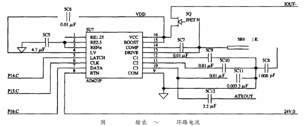 HT2012需要外部提供460.8kHz的時(shí)鐘信號,且要求時(shí)鐘頻率的誤差是0.1%,若直接入一個(gè)460.8kHz的晶振不僅會(huì)引起系統(tǒng)功耗的增加,而且該晶振屬于非標(biāo)準(zhǔn)晶振,需專門定制。為了解決這一問題,在系統(tǒng)中采用一片1.8432MHz的晶振以產(chǎn)生時(shí)鐘信號,再經(jīng)分頻器CD4013進(jìn)行4分頗,可輸出1.8432MHz/4=460.8kHz的分頻信號供HT2012使用。AD421其內(nèi)部的電壓調(diào)節(jié)器與外部的場效應(yīng)管DN25D對輸入到AD421的電壓進(jìn)行調(diào)整,可提供+3.3V電壓作為其他設(shè)備的電源。HART發(fā)出的FSK信號,經(jīng)過一個(gè)電容耦合送到AD421中,轉(zhuǎn)換成相應(yīng)的0.5mA正弦電流信號,實(shí)現(xiàn)電壓信號到電流信號的轉(zhuǎn)換,同時(shí),疊加在4~20mA的電流上送給接收設(shè)備,實(shí)現(xiàn)了HART協(xié)議的信息的交換。本電路耦合電容取為0.0033μF,如圖5所示。