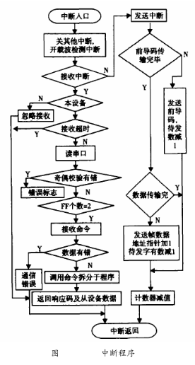 在HART通信中,鉆井泥漿流量計(jì)作為從設(shè)備進(jìn)行通訊,所以這里的軟件設(shè)計(jì)只是針對于從設(shè)備。HART通信采用水平和垂直校驗(yàn)的方法。當(dāng)檢測到接收數(shù)據(jù)有差錯(cuò)時(shí),則等到主設(shè)備命令幀發(fā)完后,通知主設(shè)備數(shù)據(jù)接收有誤。主設(shè)備則重新發(fā)命令幀,從而保證通信的準(zhǔn)確可靠。HART中斷子程序流程圖如圖6所示。由于HART通信為主從方式,HART幀中每個(gè)字節(jié)在物理層傳輸需要9ms左右,為了保證通訊的實(shí)時(shí)性,通訊程序采用串行口終端接收/發(fā)送。該中斷所要完成通信中的主要任務(wù),即接收和發(fā)送幀,幀的拆分和打包。