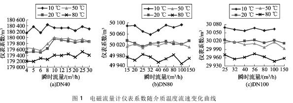 將實(shí)驗(yàn)測得的耐腐蝕排污管道流量計(jì)在不同溫度及流速下的儀表系數(shù)數(shù)據(jù)整理,特性曲線如圖1所示,3組曲線分別對應(yīng)DN40、DN80、DN100的3塊耐腐蝕排污管道流量計(jì)的儀表系數(shù)曲線。