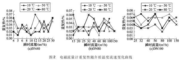 將實(shí)驗(yàn)測得的耐腐蝕排污管道流量計(jì)在不同溫度及流速下的重復(fù)性數(shù)據(jù)整理,特性曲線如圖2所示,3組曲線分別對應(yīng)DN40、DN80、DN100的3塊耐腐蝕排污管道流量計(jì)的重復(fù)性曲線。