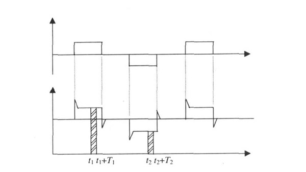 污水管道流量計一般都采用工頻交流電源供電, 其電源電壓的幅值和頻率的變化都會給污水管道流量計帶來電源性干擾噪聲。對電源電壓的幅值變化, 因采用多級集成穩(wěn)壓, 一般而言電源電壓的幅值變化對電磁流量的測量精度影響不大。當電源電壓的頻率波動時, 雖然其波動范圍有限, 但對污水管道流量計測量精度影響較大。為了解決工頻干擾問題, 實現(xiàn)對流體流速感應(yīng)電勢eab信號的準確測量, 需利用以下基本關(guān)系:①勵磁周期為工頻周期的整數(shù)倍, 即勵磁頻率為50/nHz(n為偶數(shù));②正負勵磁下的同相位采樣。圖2是對應(yīng)低頻矩形波勵磁形式下的典型電勢信號形式, 按上述關(guān)系在一個勵磁周期下, 若假設(shè)t1 和t2 點為工頻干擾的等效干擾點, 且采樣寬度T=T1 =T2 , 則eab的基本算式為: