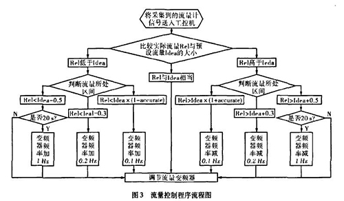 實(shí)際生產(chǎn)中流量一直在某個(gè)區(qū)域內(nèi)波動(dòng),且其動(dòng)態(tài)特性不易掌握。從上面的理論中我們能夠讓誤差△£盡可能的小,這樣距我們所需要的理論值%就越接近。而減小誤差需要我們把n取的盡可能大,也就是在生產(chǎn)時(shí)間內(nèi)劃分更多的周期去調(diào)節(jié)流量。當(dāng)工控機(jī)根據(jù)稀硝酸專用流量計(jì)傳送回來(lái)的信號(hào)發(fā)出調(diào)節(jié)變頻器工作頻率的指令后,電機(jī)調(diào)整功率到稀硝酸專用流量計(jì)的實(shí)際測(cè)量為一個(gè)工作周期,我們知道從指令發(fā)送到實(shí)際測(cè)量值返回有一個(gè)較大的滯后,如果調(diào)節(jié)的周期時(shí)間小于流量計(jì)本身的一個(gè)工作周期,那么顯然不可能達(dá)到減小誤差的目的。利用模糊控制思想H。,在控制程序中我們把流量的波動(dòng)區(qū)域劃分為±缸×Yo,Yo-t-O.3,Yo±0.5四個(gè)區(qū)域,其中缸為可調(diào)節(jié)的誤差范圍,生產(chǎn)中我們?nèi)?.015,流量區(qū)域劃分的單位均為t/h。針對(duì)不同的區(qū)域采取不同的調(diào)整方案。具體流程如圖3所示。圖中變量Rel表示實(shí)際測(cè)量的流量,變量Idea表示理論流量。