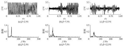 試驗(yàn)發(fā)現(xiàn),氣相的加入對(duì)過熱蒸汽流量計(jì)測量的影響顯著,譜分析和脈沖計(jì)數(shù)兩種方法隨著氣相注入的增加其表現(xiàn)也不同。圖4反映了水流量12m3/h時(shí),注入不同氣含率β時(shí)A點(diǎn)的模擬信號(hào),如圖4(a~c)所示;經(jīng)譜分析后得到的頻率值,如圖4(d~f)所示;用脈沖計(jì)數(shù)方法得到的脈沖信號(hào),如圖4(g~i)所示。圖4顯示,當(dāng)注入氣量不大時(shí),對(duì)過熱蒸汽流量計(jì)的影響不大,無論是譜分析結(jié)果還是脈沖計(jì)數(shù)得到的結(jié)果都比較好。當(dāng)注入的氣量進(jìn)一步增加時(shí),渦街原始信號(hào)強(qiáng)度和穩(wěn)定性逐漸變差,渦街頻率信號(hào)會(huì)被干擾信號(hào)所淹沒,反映到譜分析圖是,渦街頻率的譜能量減小,干擾信號(hào)的譜能量加強(qiáng);對(duì)于脈沖信號(hào),會(huì)因?yàn)橐恍┬郎u信號(hào)減弱,形成脈沖缺失現(xiàn)象,而不能真實(shí)地反映渦街產(chǎn)生的頻率。