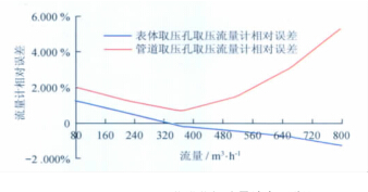 從以上數(shù)據(jù)表和曲線圖中可以看出:天燃?xì)饬髁坑?jì)型號(hào)一定的情況下,用表體取壓孔取壓方式檢定流量計(jì)時(shí)流量計(jì)的線性度較好,用管道取壓孔取壓方式檢定流量計(jì)時(shí)流量計(jì)的線性度較差;流量測點(diǎn)相同的情況下,表體取壓孔取壓檢定方式的流量計(jì)誤差較小,管道取壓孔取壓檢定方式的流量計(jì)誤差較大;兩種取壓方式引起的誤差隨著流量的增大而逐漸增大,在流量為2?。梗埃埃恚常钑r(shí)兩者相差近6.2%,遠(yuǎn)遠(yuǎn)超出了流量計(jì)的準(zhǔn)確度等級(jí)。所以,在天燃?xì)饬髁坑?jì)的檢定過程中,應(yīng)避免在流量計(jì)表體取壓孔以外的地方取壓進(jìn)行檢定。