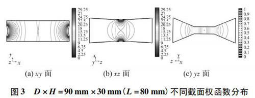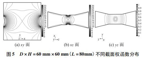 4) 圖 3( c) 、圖 4( c) 的 yz 面權(quán)函數(shù)分布表明,D = 90 mm時的權(quán)函數(shù)等勢線間距略大于 D = 60 mm 時的權(quán)函數(shù)等勢線間距,權(quán)函數(shù)變化梯度較小,且中心區(qū)域的權(quán)函數(shù)等勢線逐漸變?yōu)橹本€,因此 D = 90 mm 的權(quán)函數(shù)分布更均勻一些,但是兩者區(qū)別很小,即寬度改變對 yz 面權(quán)函數(shù)分布影響很小。圖 4( c) 、圖 5( c) 的 yz 面權(quán)函數(shù)分布表明,H = 30 mm時的權(quán)函數(shù)等勢線間距較大,且中心區(qū)域的權(quán)函數(shù)等勢線逐漸變?yōu)橹本€,因此 H = 30 mm 的權(quán)函數(shù)分布更加均勻;