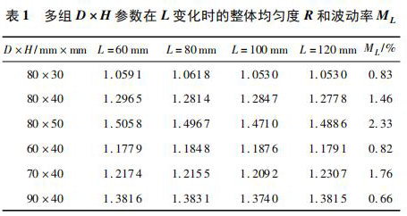 計算多組相同 D × H、不同 L 時 xy 平面的權(quán)函數(shù)整體均勻度 R 及波動率 ML,如表 1 所示。