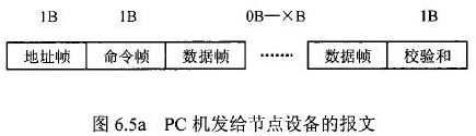 在插入式電磁流量計等節(jié)點設(shè)備和C機通信的過程中,由地址幀、命令幀、數(shù)據(jù)幀、校驗和可組成各種功能不同的報文。由于采用主從工作方式來實現(xiàn)通信,插入式電磁流量計等節(jié)點設(shè)備僅能接收并執(zhí)行PC機發(fā)送來的控制命令,而不能發(fā)送命令給PC機。因此,由PC機發(fā)往流量計等節(jié)點設(shè)備的報文一般包括一個地址幀,一個命令幀,若干個數(shù)據(jù)幀和一個校驗和,其報文格式圖.6a5所示;而由流量計等節(jié)點設(shè)備發(fā)往PC機的報文一般包括一個地址幀,若干個數(shù)據(jù)幀和一個校驗和,其報文格式如圖6.5b所示。