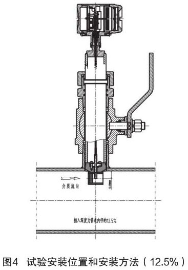 根據(jù)中華人民共和國機械行業(yè)標準:JB/T9249-2015《煙氣流量計》進行氣體渦輪流量計的研制與設計。在試驗過程中,因為理論研究不充分,再加上經(jīng)驗不足,采用插入深度是按照以往其它產(chǎn)品(插入式電磁流量計)的經(jīng)驗,以插入深度為現(xiàn)場管道內(nèi)徑的 12.5% 進行試驗,其對介質(zhì)流量的檢測值與同種規(guī)格管道法蘭式結構的煙氣流量計進行比較,偏差值較大、儀表準確度無法滿足設計要求。試驗安裝位置和安裝方法如圖 4 所示。