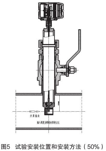 氣體渦輪流量計插入式電磁流量計的結構原理進行分析,插入式電磁流量計的信號采集點在標校管道內(nèi)12.5% 為宜,因它屬電磁類流量計,而煙氣流量計是根據(jù)“卡門渦街”原理進行測量管道內(nèi)流量,根據(jù)標校管道內(nèi)層流和湍流的分析,以及氣體渦輪流量計獨特的探頭結構形式,確定氣體渦輪流量計的插入深度為標校管道內(nèi) 50%,試驗安裝位置和安裝方法如圖 5 所示。