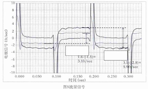 舉例,如圖5所示,線圈采用5Hz驅(qū)動時的0feet/s,3.1feet/s,5.9feet/s流速下的電極信號,利用上述方法對信號進(jìn)行處理并計算流速。取每半波*后的20%納入流速計算,正半波與負(fù)半波相減即是流速。如3.1feet/s–(-2.8feet/s)=5.9feet/s,雖然有+0.15 feet/s的直流偏置,但也不影響流速的計算。因線圈是5Hz驅(qū)動,半波的20%是20ms,正好是1個完整的工頻周期,這樣就不受工頻干擾的影響。正半波與負(fù)半波相減,這樣就避免了直流偏置和共模干擾的影響。再加上在數(shù)字濾波過程中使用限幅濾波和算數(shù)平均,保證了流量信號的有效提取。