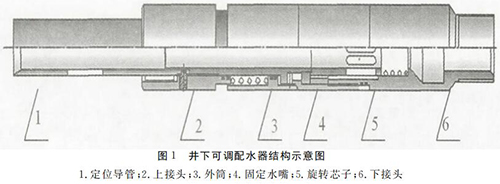 井下可調(diào)配水器主要由定位導(dǎo)管、上接 頭、外 筒、旋轉(zhuǎn)芯子、固定水嘴、下接頭等部件組成,如圖1
