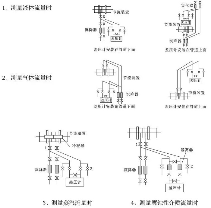 根據(jù)被測介質(zhì)的性質(zhì)、節(jié)流裝置與差壓計(jì)的相對(duì)位置,差壓信號(hào)管路可有以下幾種安裝方式: