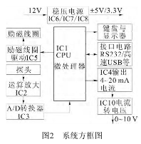 裝置采用模塊(裝置采用模塊(STM32F217STM32F217)來(lái)控制電磁流量)來(lái)控制化工污水流量計(jì)選型的工作,包括產(chǎn)生勵(lì)磁脈沖方波信號(hào)、接收從探頭計(jì)的工作,包括產(chǎn)生勵(lì)磁脈沖方波信號(hào)、接收從探頭送來(lái)的反映流量大小的微弱電信號(hào)、輸出送來(lái)的反映流量大小的微弱電信號(hào)、輸出4~20mA電流信號(hào)供指示儀表用,模塊附帶有各類接口電路電流信號(hào)供指示儀表用,模塊附帶有各類接口電路(RS232、高速USB接口等)。裝置包括:接口等)。裝置包括:IC1單片機(jī)、IC2前置放大器、IC3A/DIC3A/D轉(zhuǎn)換器、IC4電壓轉(zhuǎn)電流模塊、IC5勵(lì)磁線圈的驅(qū)動(dòng)模磁線圈的驅(qū)動(dòng)模塊電路、IC6電壓轉(zhuǎn)換模塊,以壓轉(zhuǎn)換模塊,以及USB快速接口電路、IC9芯片與周圍元件組片與周圍元件組成的RS232接口等電路。方框口等電路。方框圖如圖2所示。