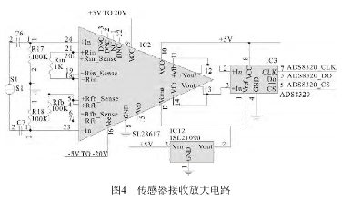 IC2(SL28617)放大器用于放大傳感器送來(lái))放大器用于放大傳感器送來(lái)的反映流量大小的電壓信號(hào),圖中的反映流量大小的電壓信號(hào),圖中Rin和Rfb是用來(lái)改變運(yùn)算放大器增益的電阻。來(lái)改變運(yùn)算放大器增益的電阻。S1是勵(lì)磁信號(hào)源,R17、R18是輸入偏置電阻,運(yùn)放的是輸入偏置電阻,運(yùn)放的9腳和16腳分別接電源±腳分別接電源±5V,接在運(yùn)放IC2輸出端的IC3(ADS8320 ADS8320)是16位高速A/D轉(zhuǎn)換器,其轉(zhuǎn)換速度可達(dá)16kHz/s,接在接收放大器與接在接收放大器與A/D轉(zhuǎn)換器之間的IC12(ISL21090 ISL21090)是三端穩(wěn)壓器。電路如圖)是三端穩(wěn)壓器。電路如圖4所示。