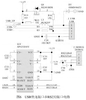 由Q1、R14、R15、R16、L3、D3、R8和R9等元件組成的電路與單片機(jī)對(duì)應(yīng)電路,組成等元件組成的電路與單片機(jī)對(duì)應(yīng)電路,組成USB快速接口電路??焖俳涌陔娐?。IC9(SP3232EEY)芯片與周圍元)芯片與周圍元件組成RS232接口電路。電路如圖6所示。